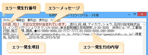 このとき、デスクトップ上に「名刺管理インポートエラーファイル」というテキストファイルが作成されます。このテキストファイルには、エラーの発生箇所を示す内容(エラーが発生した行番号、項目名、エラーメッセージ、行の内容)が記載されています。