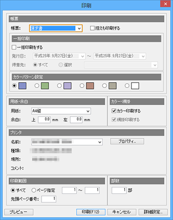 [見積書][請求書][領収書][注文書]ウィンドウの[印刷]ダイアログと[詳細設定]ダイアログ固有の項目について解説します。