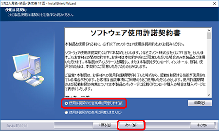 | 4. | 表示されるツカエル見積・納品・請求書の「ソフトウェア使用許諾契約書」を読み、同意した上で[使用許諾契約の全条項に同意します]をクリックしてから、[次へ]ボタンをクリックします。 |
