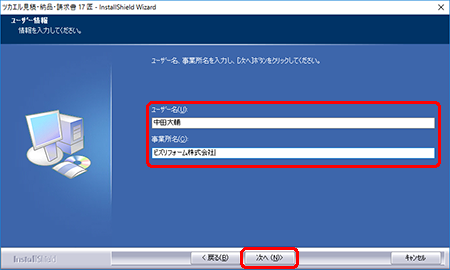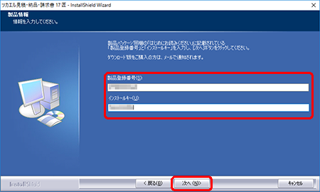 | 6. | 「製品登録番号」「インストールキー」を半角大文字で入力し、[次へ]ボタンをクリックします。 |