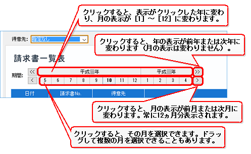 年をまたいで複数の月を選択するには、月表示を切り替えるボタンで開始月と終了月を表示し、開始月から終了月までをドラッグします。