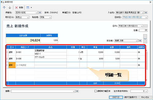 [売上新規作成(修正)]ダイアログでは、「明細一覧」で取引の明細を入力(修正)することができます。次に、明細一覧の項目を示します。