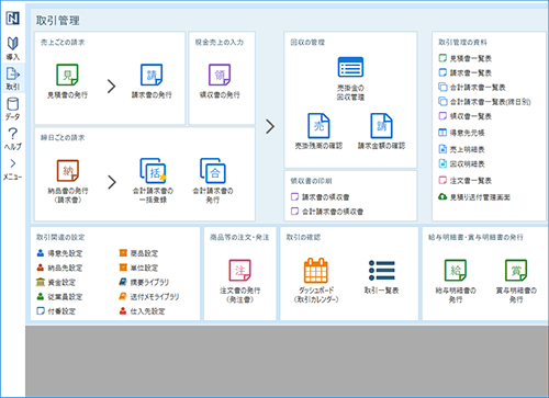 ナビゲーションバーは、「ツカエル見積・納品・請求書の導入」「売上の入力」などの操作の分類ごとに、一連の操作で利用する(または関連する)ウィンドウやダイアログをフロー形式で示します。各分類のボタン(アイコン)をクリックすると、そのウィンドウやダイアログを表示することができます。