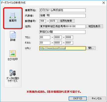 ●[データファイルの新規作成]ダイアログの[事業所]ページの項目