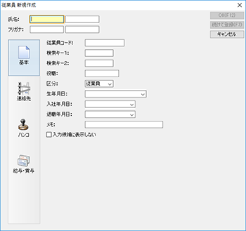 | 3. | 表示された[従業員新規作成]ダイアログで各項目を入力します(詳細)。 ダイアログ左側のボタンをクリックして、設定ページを切り替えて各ページの項目を入力してください。 |
