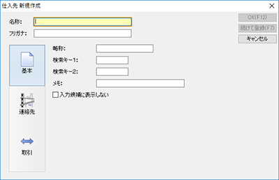 | 3. | 表示された[仕入先新規作成]ダイアログで各項目を入力します(詳細)。 ダイアログ左側のボタンをクリックして、設定ページを切り替えて各ページの項目を入力してください。 |