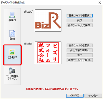 [データファイルの新規作成]ダイアログ(詳細)で[ロゴ・社印]ボタンをクリックすると、会社ロゴや社印を設定できます。