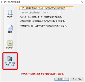 ●[データファイルの新規作成]ダイアログの[データお預かりサービス]ページの項目