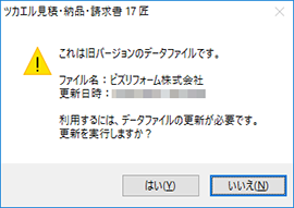 このダイアログで[はい]ボタンをクリックすると、データが更新され、新しいバージョンのツカエル見積・納品・請求書でもファイルを利用できるようになります。