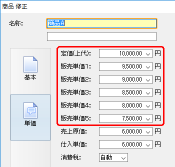 | 4. | [定価(上代)]~[販売単価5]に単価を入力し、[OK]ボタンをクリックします。 |