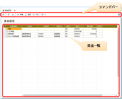 クリックすると、資金一覧で選択中の資金(金融機関)が削除されます。初期設定で用意されている「現金」「小口現金」は削除できません。 |