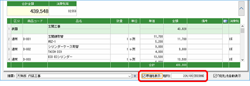 [見積書]ウィンドウでは、右下にある[原価を表示]にチェックを付けると粗利金額を表示できます。