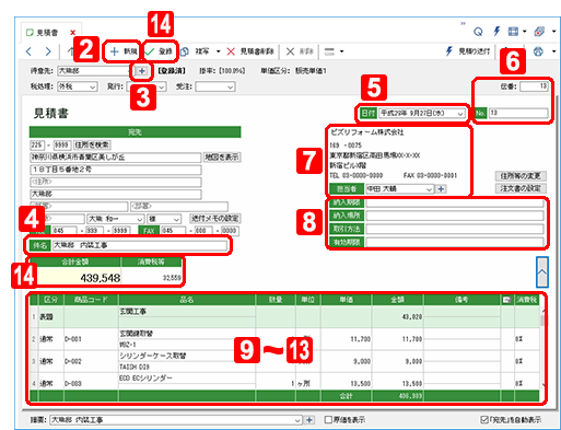 | 6. | 必要があれば、伝番や見積書番号を変更します。 |