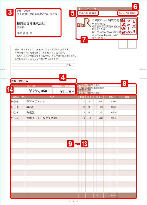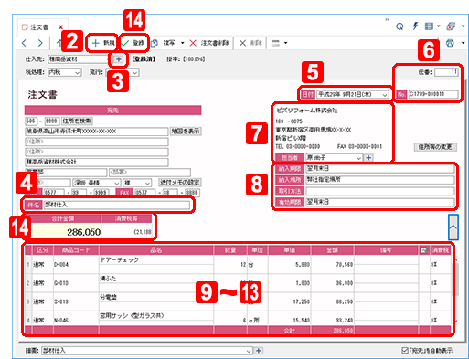 | 6. | 必要があれば、伝番や注文書番号を変更します。 |