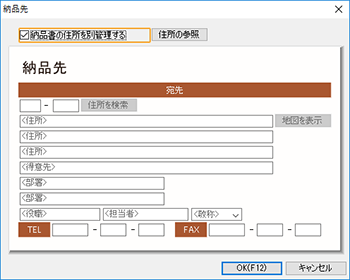 | 3. | [納品先]ダイアログが表示されるので、[納品書の住所を別管理する]にチェックを付けます。 |