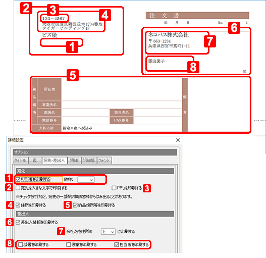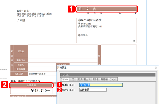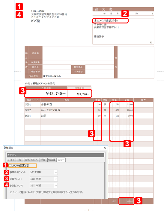 チェックを付けると、事業所名、金額などのフォントを指定できます。