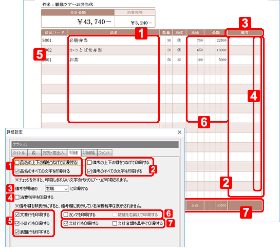 チェックを付けると、印刷される明細項目の幅の割合を調整したり、印刷するかどうかを指定できます。