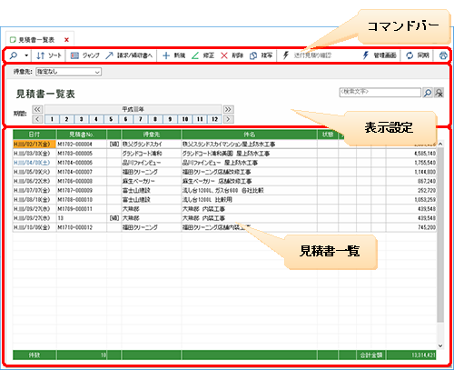 見積書をもとに請求書が作成されているときは[請]が、領収書が作成されているときは[領]が表示されます。どちらも作成されていないときは、何も表示されません。 |