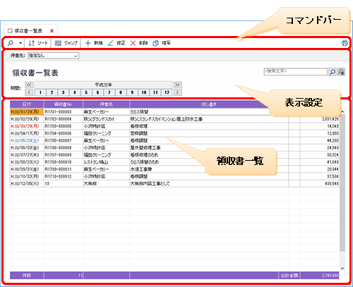 登録したいる帳票のうち、条件にあった帳票の合計金額が表示されます。 |