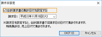 請求日を設定します。 売上日と請求日付を別に設定し、合計請求書に計上する月を売上と別の月に設定することができます。