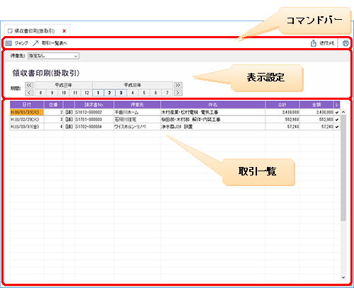[請求書]ウィンドウや取引入力ダイアログで入力した掛取引の領収書を印刷したいときは、[領収書印刷(掛取引)]ウィンドウを使います。