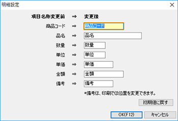 [明細設定]ダイアログの[初期値に戻す]ボタンをクリックすると、列見出し名を初期値に戻せます(初期値は、下表の[項目名])。