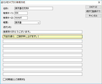 チェックが付いている送付メモが、[見積書][請求書][領収書][合計請求書][注文書]ウィンドウの[送付メモ]ダイアログの初期値となります。 |