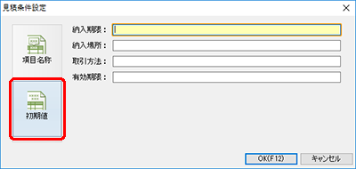 | 2. | [見積条件設定][注文条件設定]ダイアログが表示されるので、左側の[初期値]ボタンをクリックします。 |