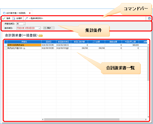 [合計請求書(一括登録)]ウィンドウでは、同じ締日の得意先の合計請求書を1度の操作で一括作成することができます。