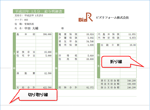 給与明細書・賞与明細書には、線に沿って金額を隠すように折ると、ちょうど封筒に収まる大きさになるように「折り線」と「切り取り線」が印刷されます。