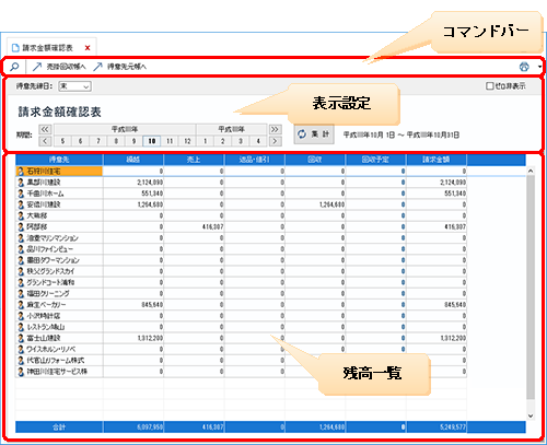 請求金額確認表は、得意先別に、月ごとの売掛金の残高を締日別に確認することができるウィンドウです。