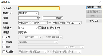 検索対象とする取引発生日を「平成13年1月1日~平成99年12月31日」で指定します。 取引発生日の色は、曜日によって変わります(平日は黒、土曜は青、日曜・祝日は赤)。 |