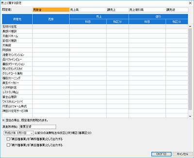 売上(と回収)の取引に関する科目の割り当てを、[売上に関する設定]ダイアログで行います。