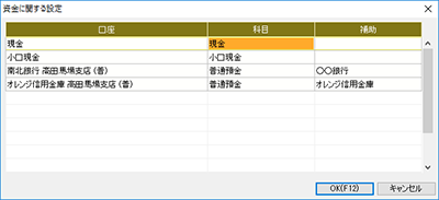 | 4. | 資金(口座など)の取引に関する科目の割り当てを行い、[OK]ボタンをクリックします。 |