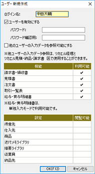 入力者権限のユーザーに、パスワード、利用できる機能、閲覧できるウィンドウを設定します。