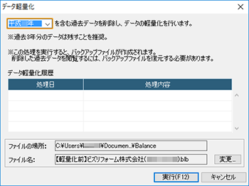 「データ軽量化履歴」欄が空欄になっている場合は、データの軽量化をしていない経理データファイルです。