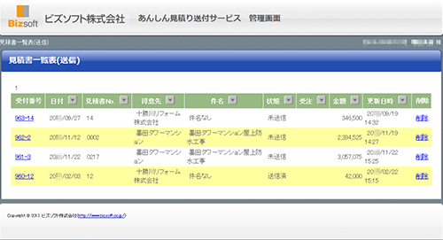 | 3. | Webブラウザが起動し、[見積書一覧表(送信)]画面が表示されるので、サーバーに送信した見積書の閲覧や状態を確認します。 |
