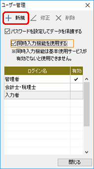 | 3. | [同時入力機能を使用する]にチェックを付け、[新規]ボタンをクリックします。 |