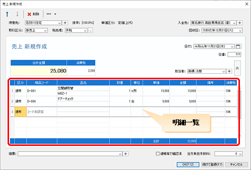 [売上新規作成(修正)]ダイアログでは、「明細一覧」で取引の明細を入力(修正)することができます。次に、明細一覧の項目を示します。