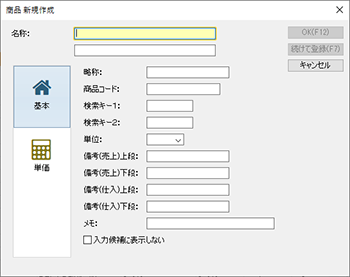 クリックすると、入力された内容を登録して、新規入力状態になります。 ([商品設定]ウィンドウから表示した場合のみ表示されます。) |