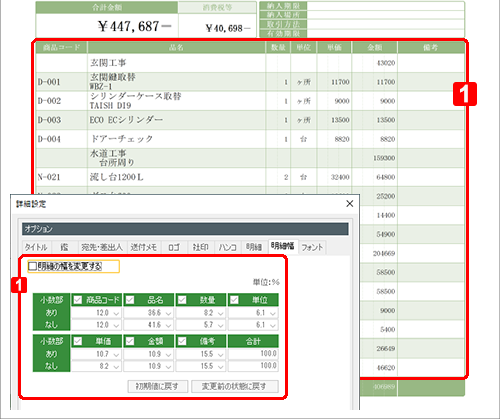 チェックを付けると、印刷される明細項目の幅の割合を調整したり、印刷するかどうかを指定できます。