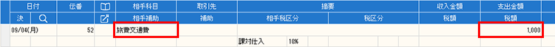 相手科目「旅費交通費」を選択し、[支出金額]に1,000円を入力します。