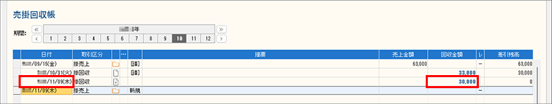 1. [日付]と[回収金額]に、2回目の回収日(11月9日)と回収金額(30,000円)を入力します。